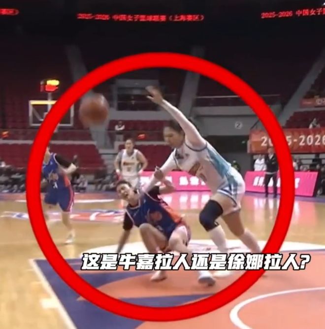 裁判没吹,比赛继续进行,仅仅2秒钟后,裁判响哨了,吹罚北京女篮队员牛嘉犯规,坐在地上,牛嘉不敢相信,她大喊——“她拉我,她拉我!”慢镜头回放显示,牛嘉没有说谎,的确是对手拉她,但反而是她吃到犯规。